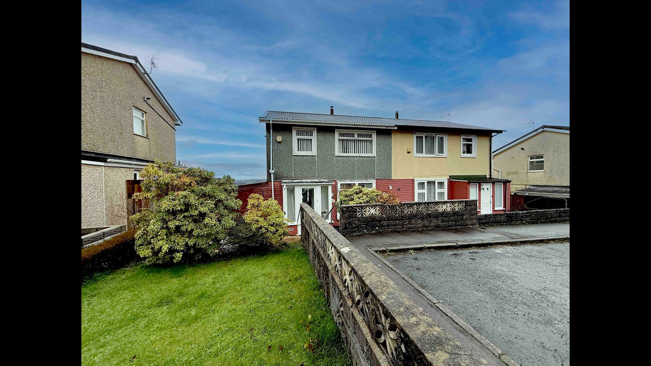 Pathway with steps down to entrance porch. There is a decently sized lawned area / front garden